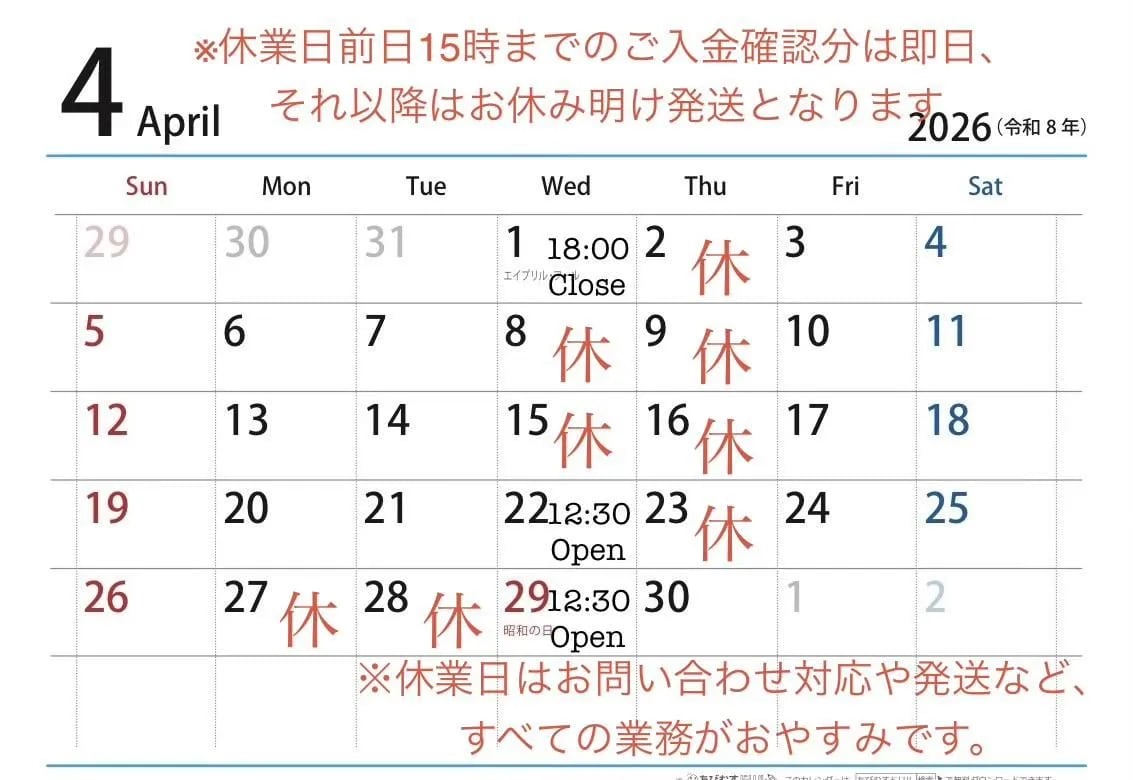 *休業日は店舗、お問い合わせ対応、発送など全てお休みとなります。