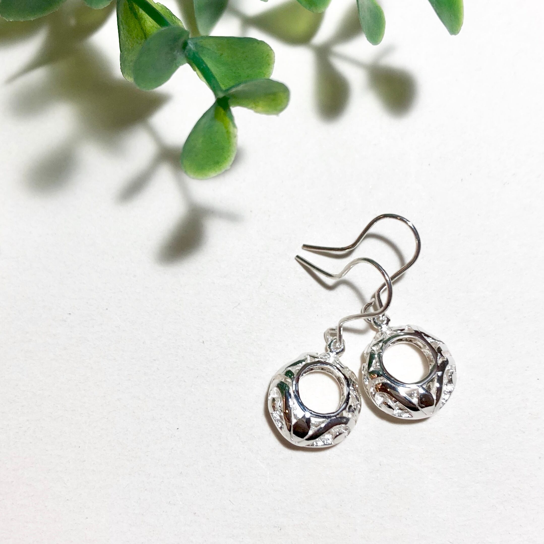*唐草のような透かし模様が施された立体的な丸いフックタイプのピアス