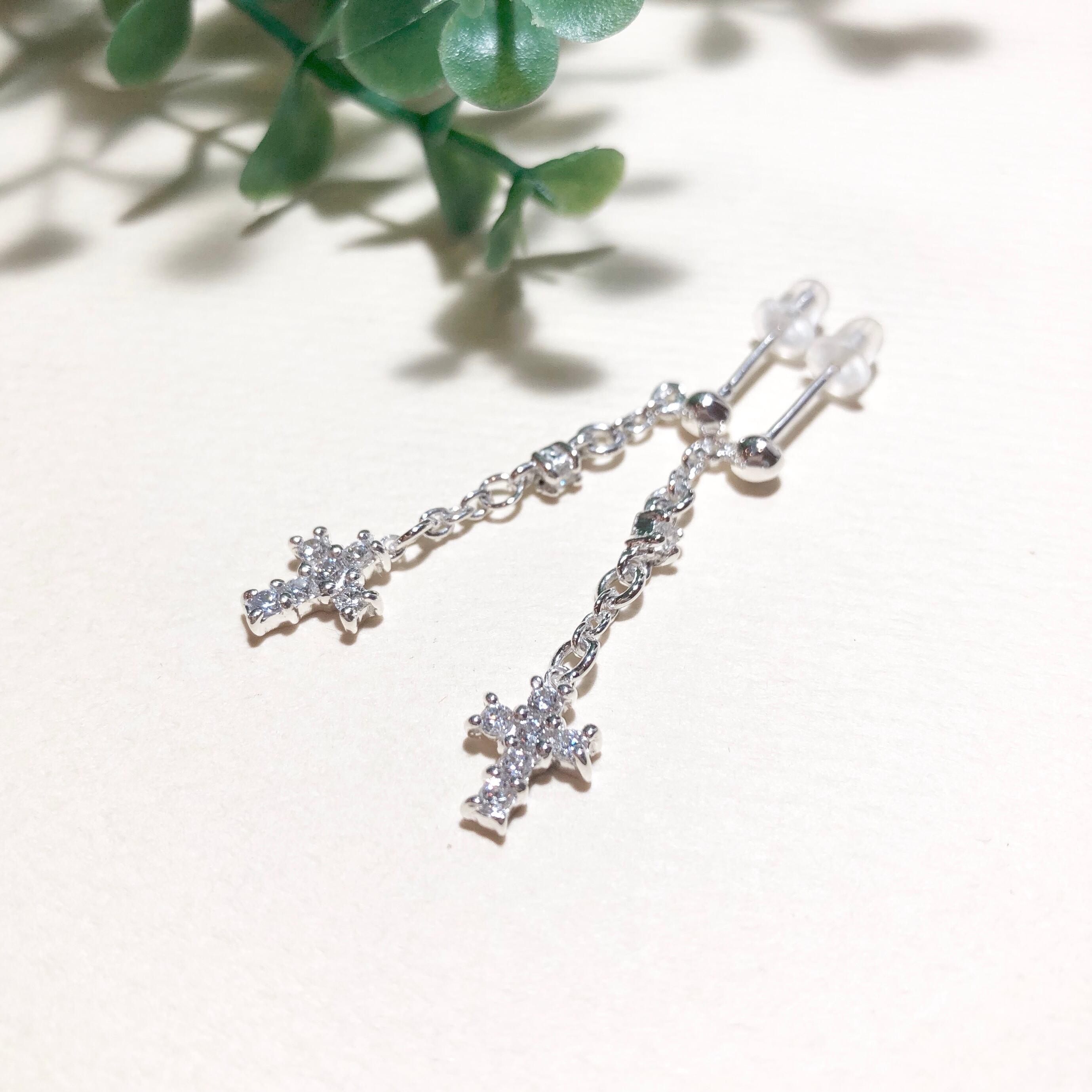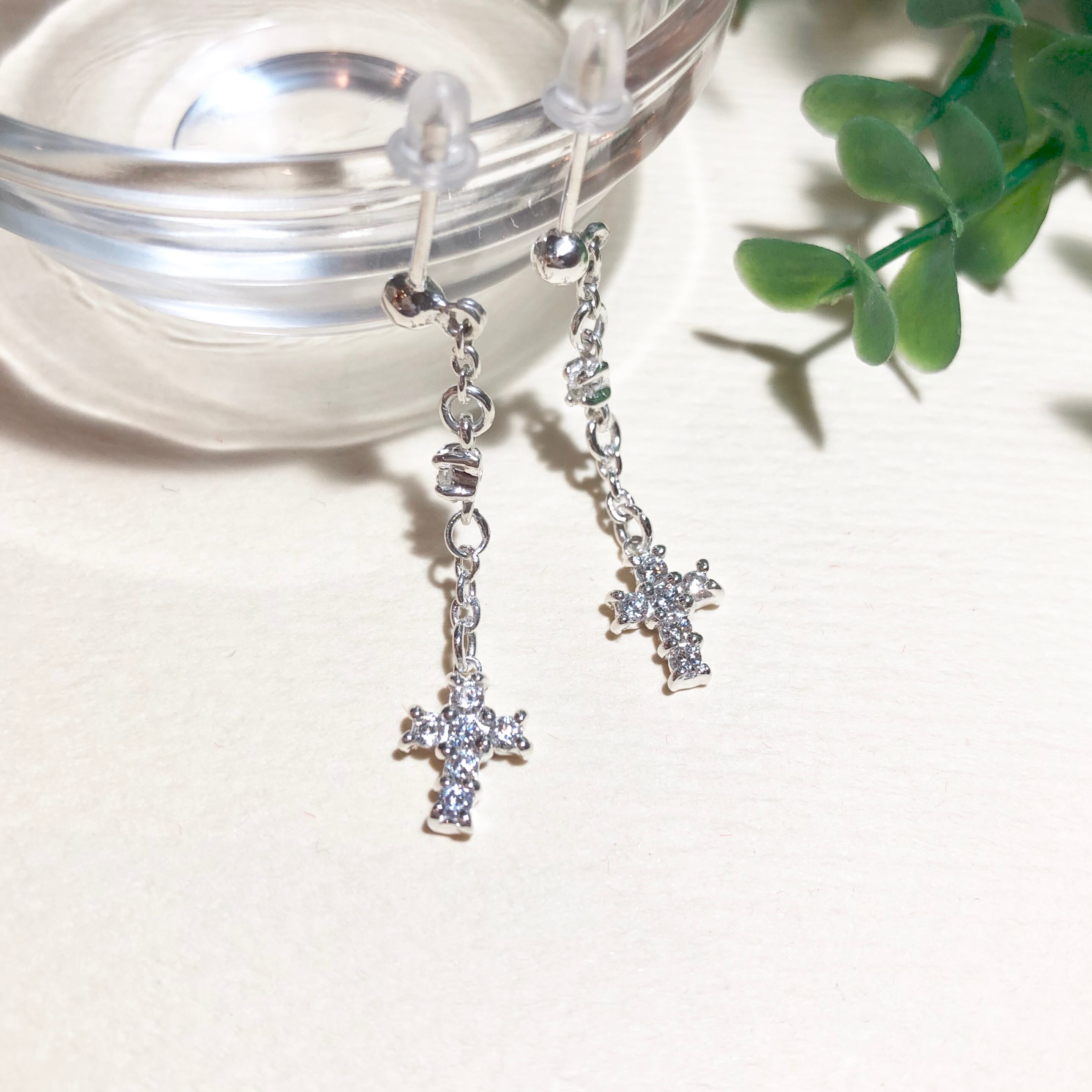 *ジルコニアが埋め込まれたクロスがゆらゆら揺れるチェーンピアス