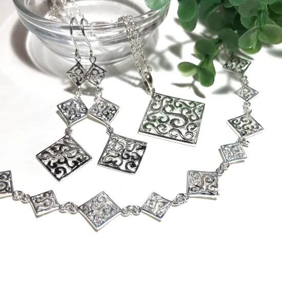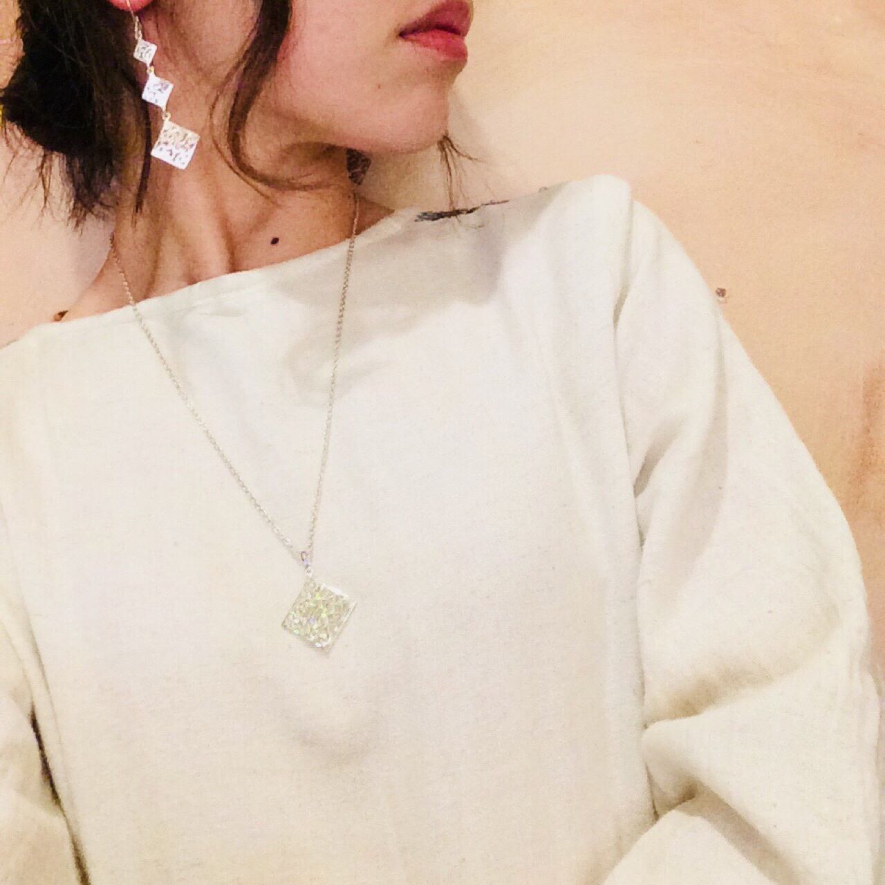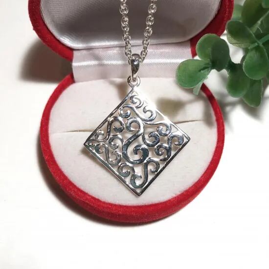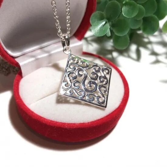 *2cm×2cmのスクエアの中に蔦のような透し模様が美しく見えるペンダント