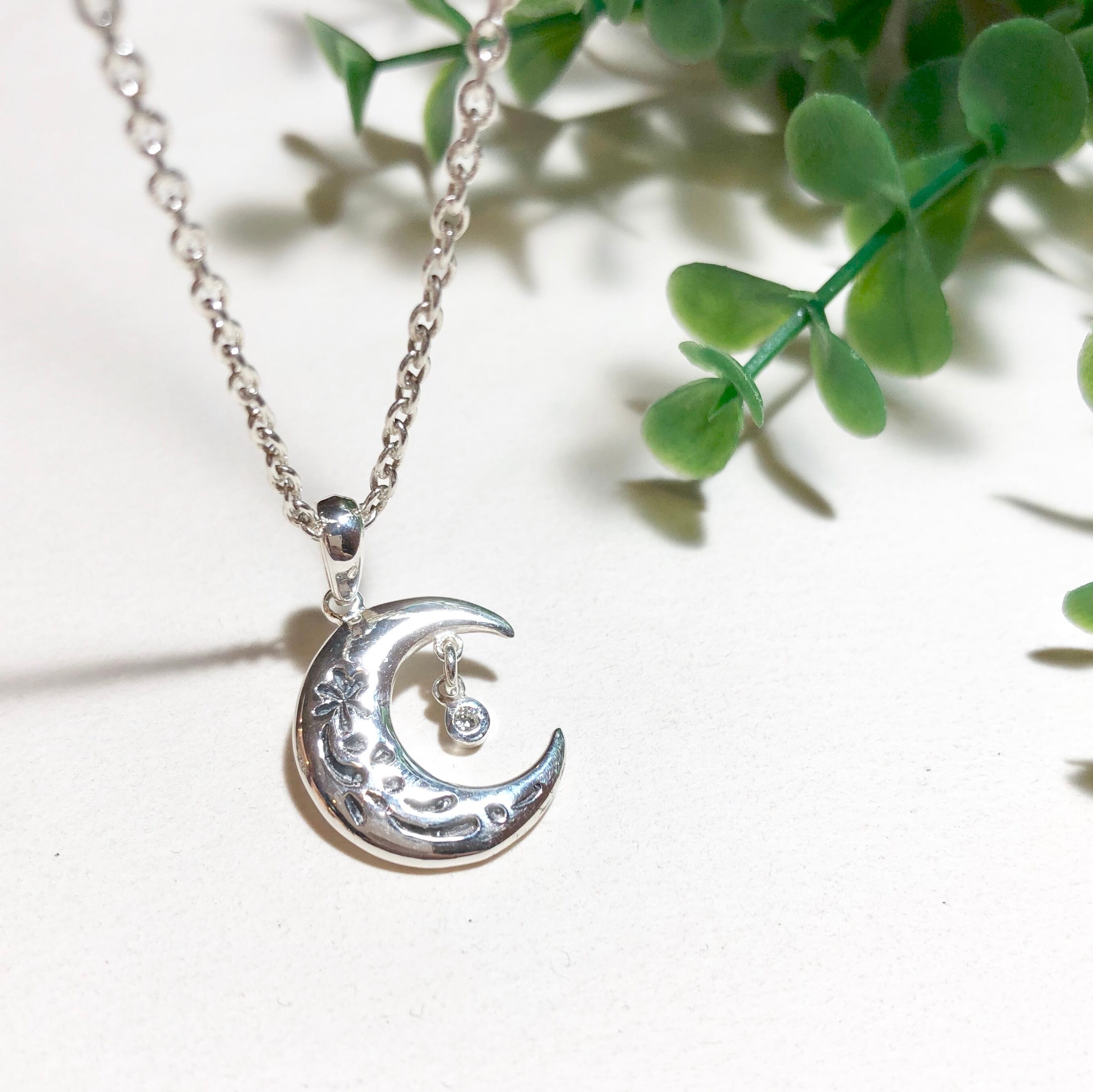 *女性らしさを象徴する人気の月モチーフに、花唐草模様が彫られたペンダント