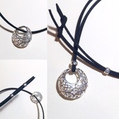 紐の端と端を重ねて留め具を2つ通したら1つはペンダント側に、もう1つは留め具に↓