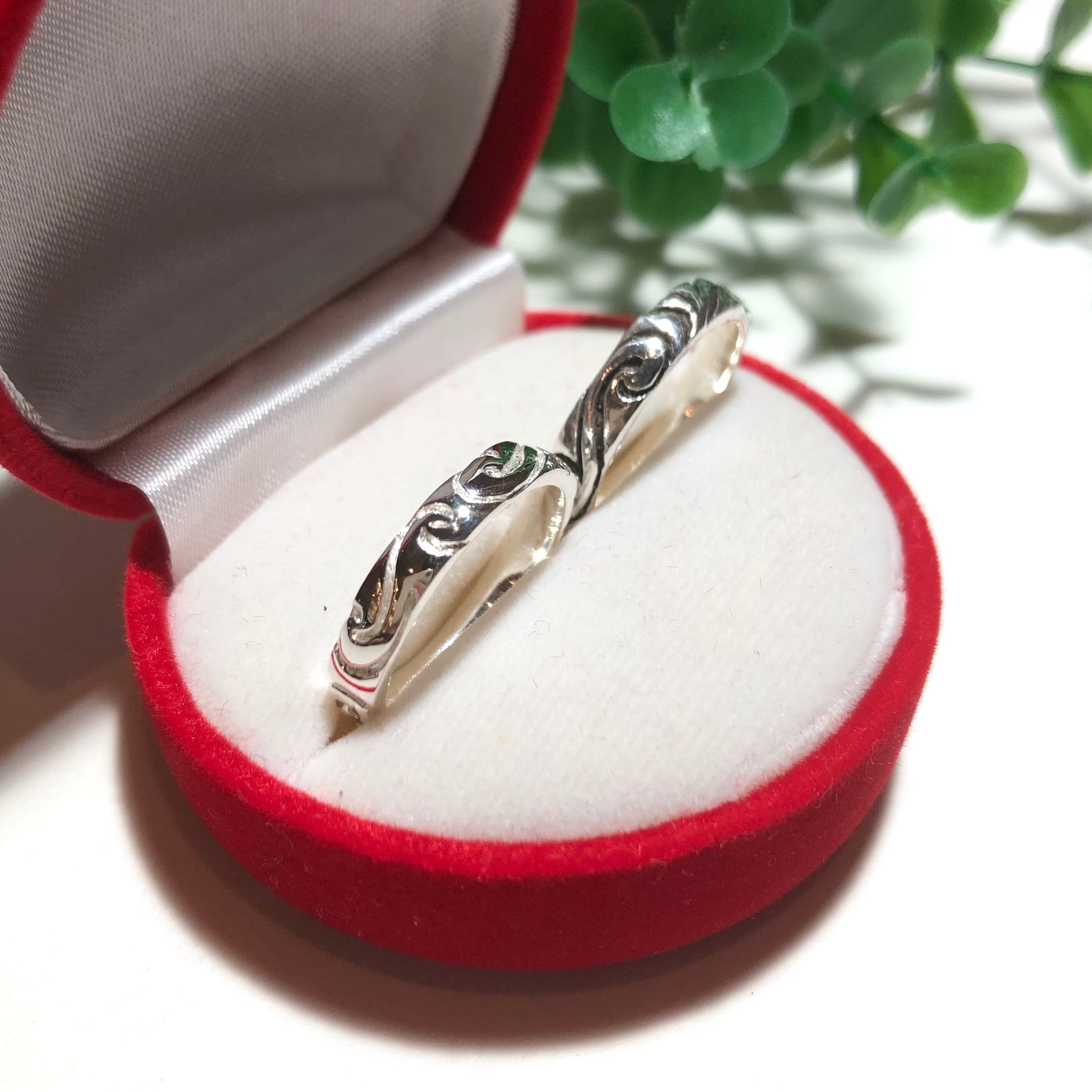 *幅約3mm、やや丸みを帯びた細身のリングにくるっと唐草模様が彫られたデザインリング