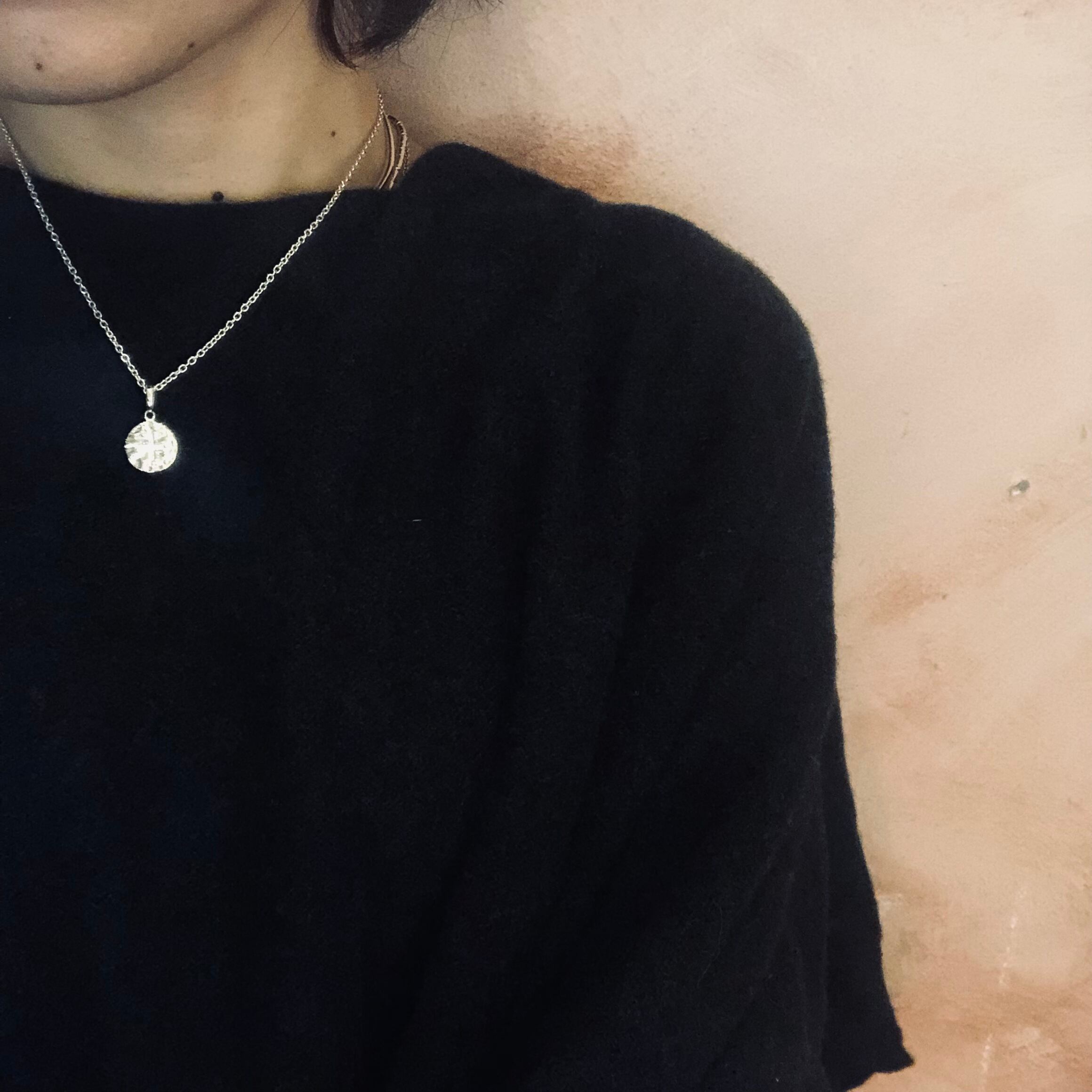 *ぽこぽこと打ちつけたようなデザインのツチ目コイン型に十字が彫られたペンダント