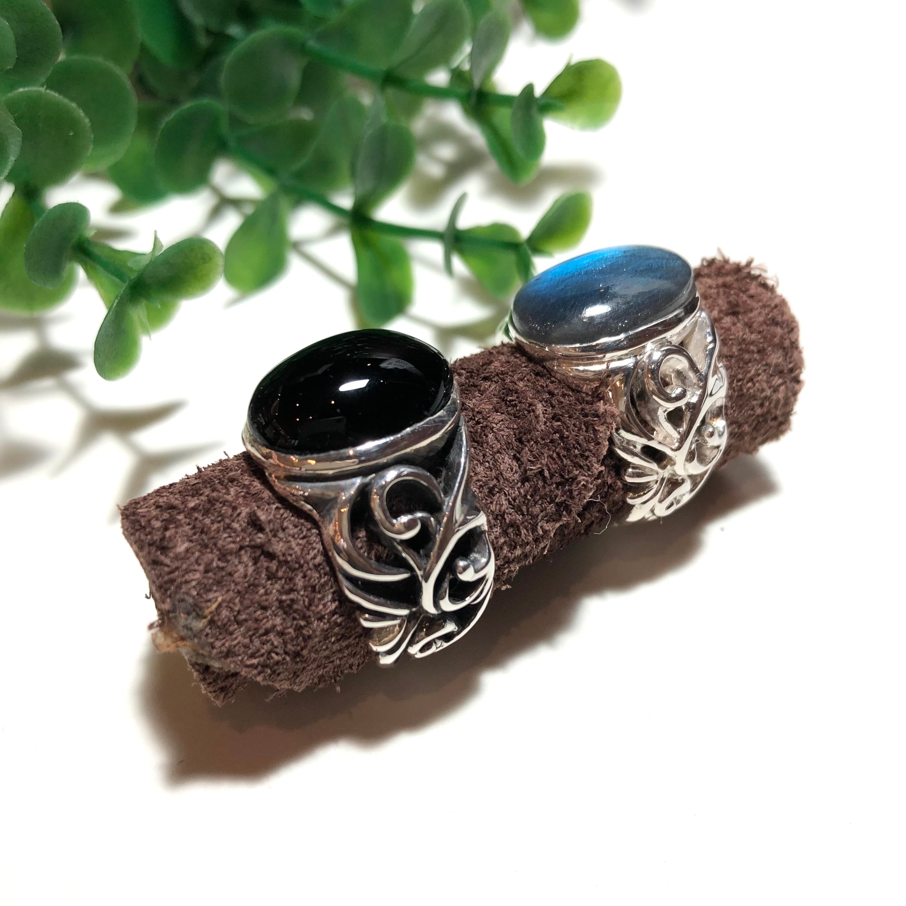 左のオニキスタイプのリングのようにリング台への燻し入れ可能。ご注文の際、備考欄にてお知らせくださいませ。