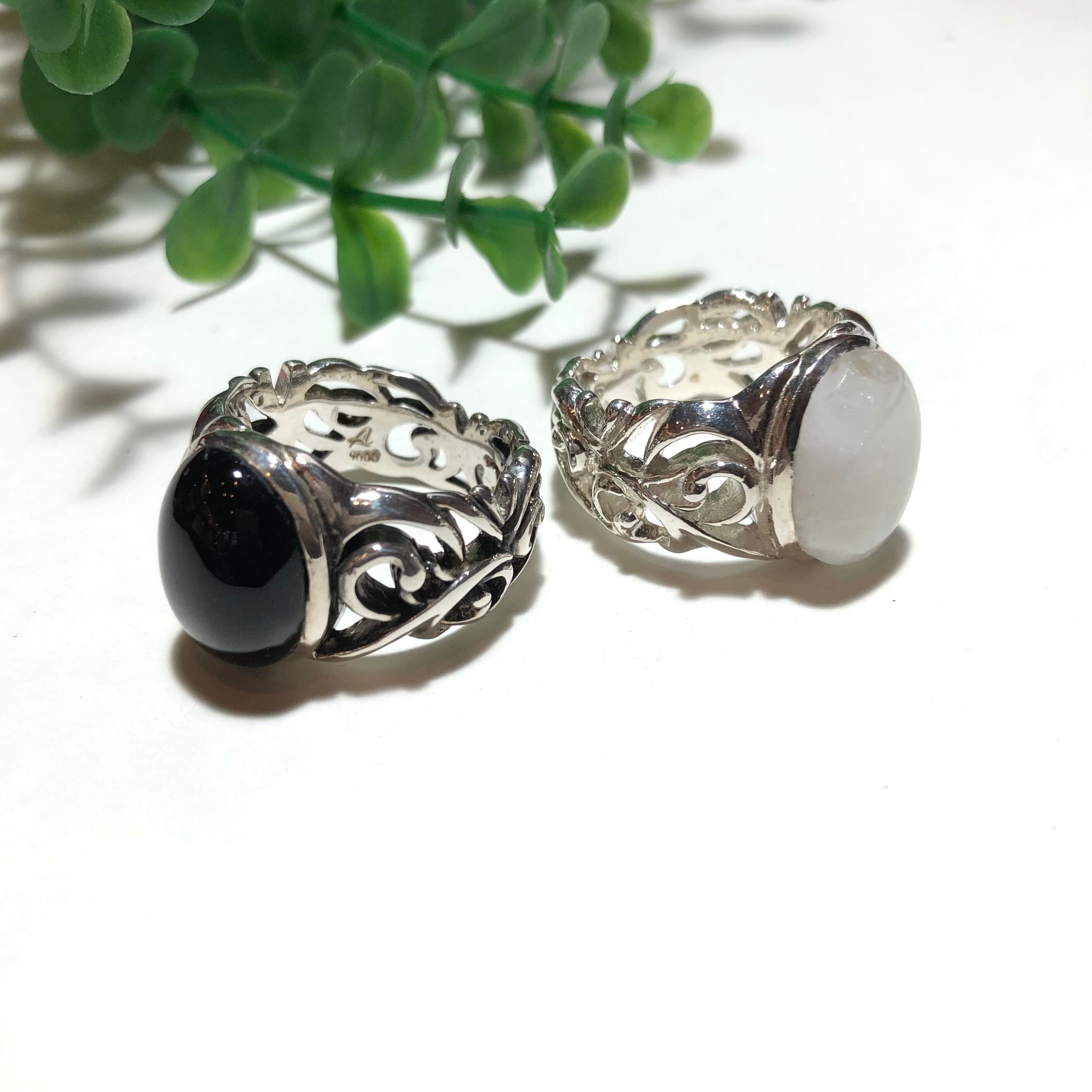 左のオニキスタイプのリングのようにリング台への燻し入れ可能。ご注文の際、備考欄にてお知らせくださいませ。