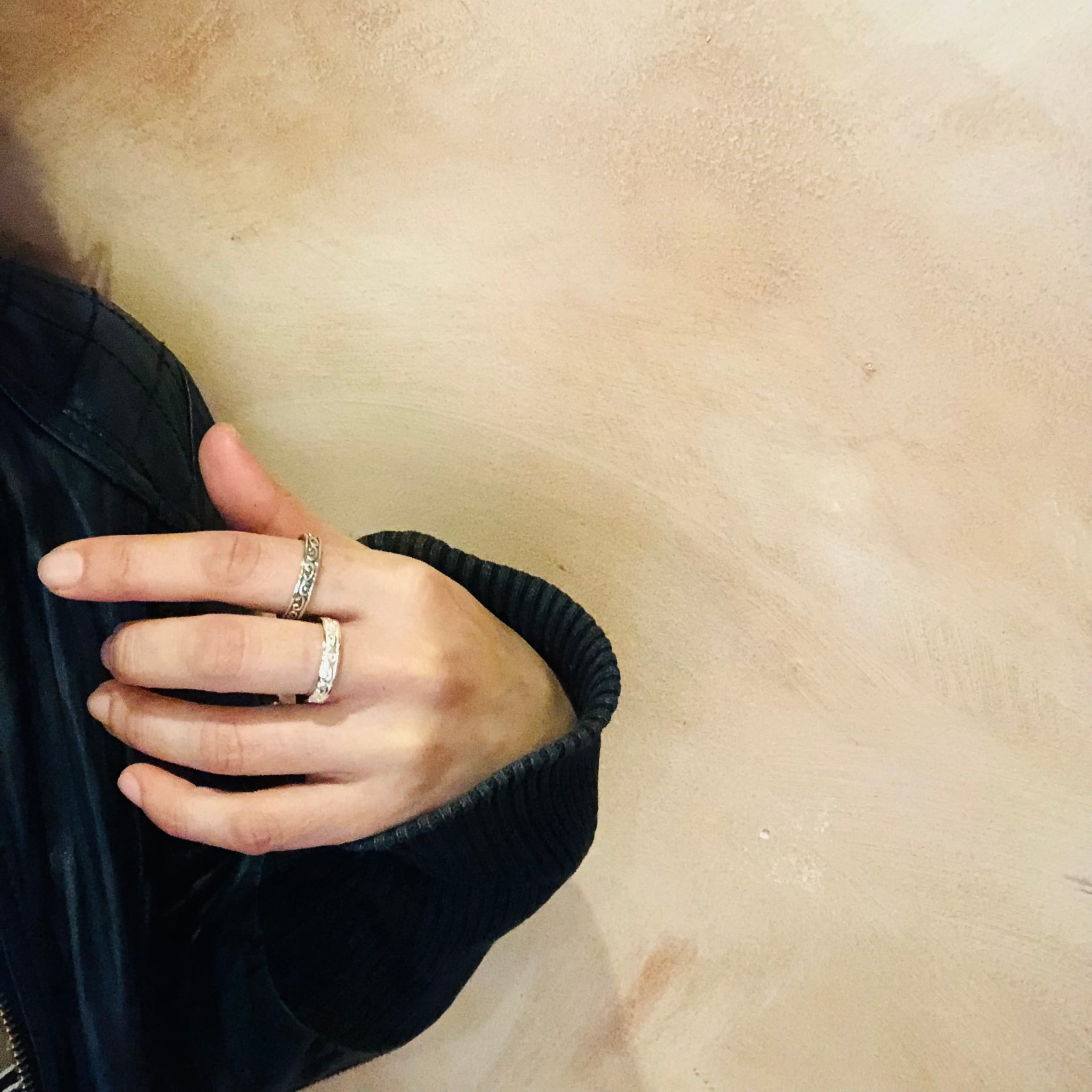 人差し指は燻しあり黒、中指はスタンダード(燻しなし白)を着用